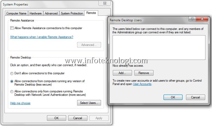 Lalu pada bagian Remote desktop pilih Allow Connection from computers running any version of Remote Desktop (less secure) supaya komputer bisa diremote oleh semua versi windows (XP, vista, server), jika memilih Allow connection only from computers running Remote desktop with Network Level Authentication (more secure) maka komputer ini hanya bisa diakses dari Windows Vista, 7 dan Windows Server 2008.